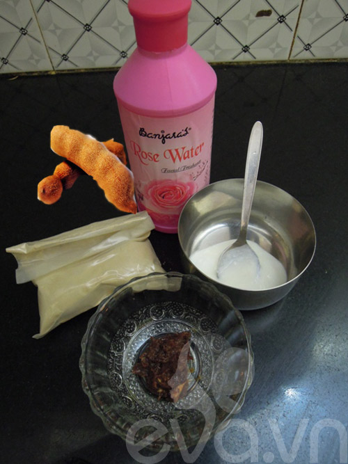 Chuẩn bị một vài quả me chín, cám gạo, nước hoa hồng, sữa chua, bát, thìa...